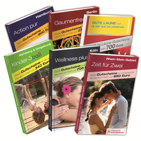 „Erlebnisse mit Gutscheinbuch.de“ ist da! Die neue Gutscheinbuch-Reihe startet in sechs deutschen Städten und Regionen mit den Ausgaben Action pur, Gaumenfreuden, Gute Laune, Kinder-Spaß, Wellness plus und Zeit für Zwei. Mit besonderen Erlebnissen vom Fallschirmsprung bis zum Mehrgänge-Menü lassen die Bücher die Herzen von Abenteurern, Gourmets, Verliebten und vielen mehr höher schlagen. Neben den Gutscheinen enthält jeder Titel allerhand Tipps und Tricks, Wissenswertes, Buntes und Spannendes rund ums Thema. Gültig ab sofort bis zum 31.10.2015!