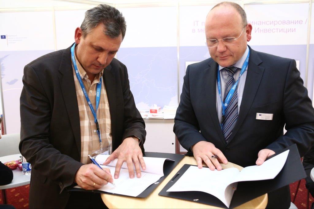 Klaus Aulenbacher schließt auf der HBI in Moskau für das Europäische Branchenkompetenzzentrum für die Gesundheitswirtschaft EUBKZGW Rahmenverträge mit dem russischen Gesundheitsministeriumüber den Einsatz eines neuen Patientenschulungssystems ab.