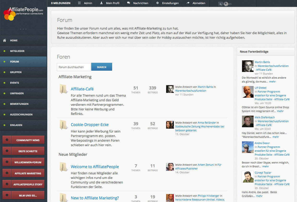 Kaum eine Branche entwickelt sich so schnell wie das Onlinemarketing. Dabei haben sich längst eigenständige Teildisziplinen wie Suchmaschinenmarketing, Social Media- oder Affiliate-Marketing entwickelt und beschreiten ganz eigene Wege für die Vermarktung von Produkten an den Endkunden. Beim Affiliate-Marketing sind daran zum Beispiel die Händler selbst, als auch deren Partnerwebseiten, Affiliate-Netzwerke und Werbeagenturen beteiligt. Ein unkomplizierter Austausch auf Augenhöhe zwischen den Beteiligten über aktuelle Entwicklungen, bewährte Strategien und Möglichkeiten für ein einfaches Vernetzen untereinander sind für den Erfolg der Branche von essentieller Bedeutung. Ein Zugang zu nützlichen Informationen und Ressourcen hilft dabei nicht nur den erfahrenen Marketern. Insbesondere auch Neulinge müssen sich schnell in der Welt des Affiliate-Marketings zurechtfinden können. Ein eigens hierfür eingerichtetes Forum verbindet all diese Elemente und bietet eine spezielle Diskussionsplattform für alle Themen rund um das Geld verdienen mit Partnerprogrammen. Betreiber der Plattform ist Karsten Windfelder, Gründer des in der Affiliate-Szene bekannten Info-Portals www.100partnerprogramme.de (http://www.100partnerprogramme.de) . Nach über einjähriger Überarbeitungsphase erlebte das Projekt AffilatePeople Ende Juli diesen Jahres einen Relaunch und verzeichnet seitdem große Zuwächse an den Mitgliederzahlen. Das Forum für den Austausch innerhalb der Affiliate-Branche wird über die Adresse www.affiliatepeople.com/forums (http://www.affiliatepeople.com/forums) erreicht. Der Registrierungsprozess funktioniert unkompliziert über ein Online-Formular oder mit Hilfe eines Facebook- oder Twitter-Profils.