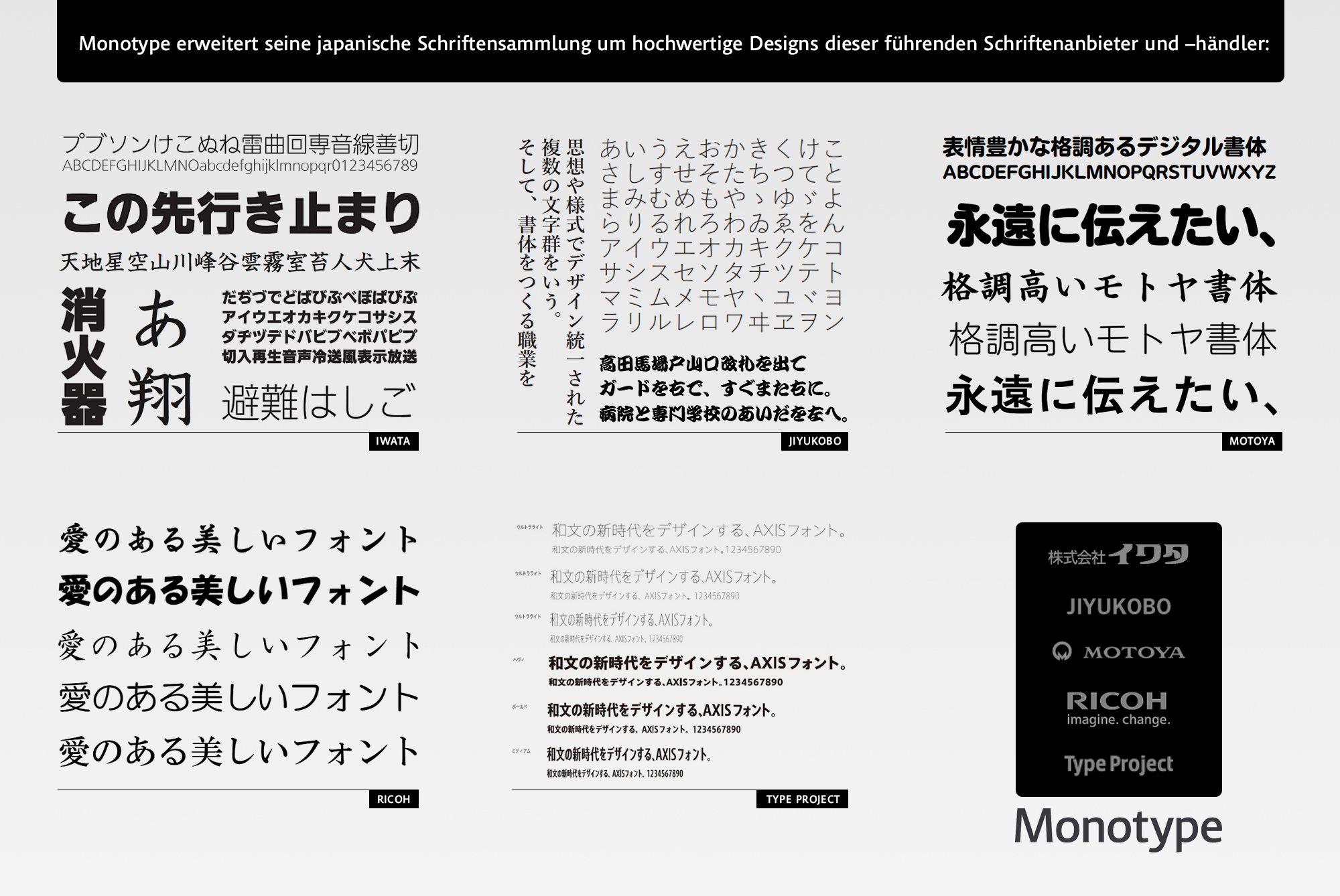 Die Monotype-Auswahl japanischer Schriften ist derzeit eine der umfangreichsten der Welt. Die neuesten Ergänzungen, die zum Teil erstmals außerhalb Japans verfügbar sind, werden über die direkten Verkaufskanäle von Monotype sowie die Webseiten Fonts.com und Linotype.com lizenziert. Zusätzlich zu Lizenzen für Webfonts und traditionelle Desktop-Fonts bestehen Lizenzierungsmöglichkeiten für mobile Anwendungen, E-Publikationen und webbasierte Services sowie für OEMs und Entwickler von Consumer-Geräten.