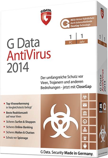 Die Sicherheitslösung schützt Internetnutzer gleich mehrfach vor Gefahren aus dem Internet: maximale Sicherheit durch die G Data CloseGap-Technologie und stündliche Signatur-Updates gegen aktuelle und länderspezifische Bedrohungen. G Data AntiVirus 2014 umfasst die nochmals verbesserte G Data BankGuard-Technologie für einen maximalen Schutz bei allen Online-Bankgeschäften. Dank des proaktiven Echtzeitschutzes sind Anwender vor allen Gefahren aus dem Internet geschützt.