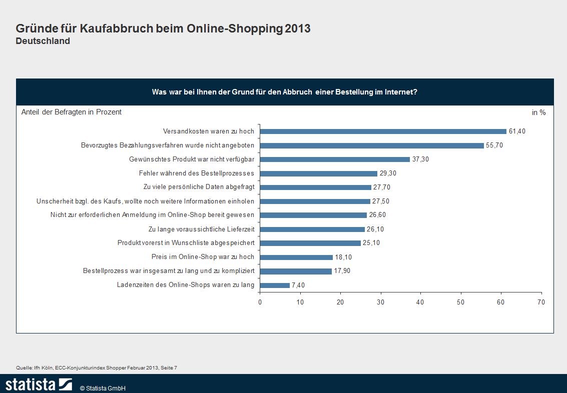 (IINews) - JA, wenn es nach einer aktuellen Statista-Studie geht (siehe Abbildung unten), die durch die lfh Köln erhoben wurde. Aus dieser geht hervor, dass mehr als die Hälfte der Befragten einen Bestellvorgang im Internet abgebrochen haben, weil ihr persönlich bevorzugtes Bezahlverfahren nicht angeboten wurde.