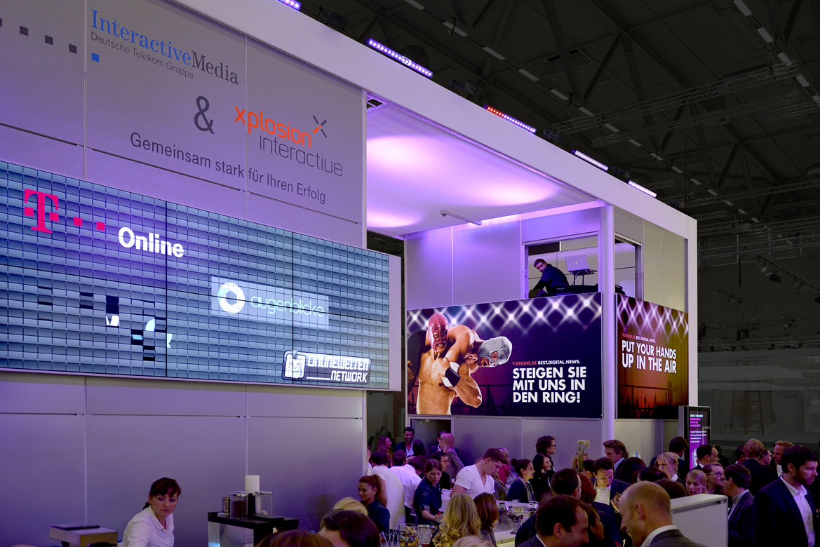 (IINews) - Taunusstein/Köln 31. Oktober 2013. Auf der diesjährigen dmexco am 18. und 19. September in Köln verwirklichte die Expotechnik Group ein überzeugendes Messekonzept für InteractiveMedia, ein Tochterunternehmen der Deutsche Telekom AG. Die offene und großflächige Gestaltung des fast 400 Quadratmeter großen Messestandes unterstrich den Aspekt des direkten Dialogs mit den Besuchern. Die Inszenierung kam bereits 2012 auf der dmexco zum Einsatz - für das diesjährige Markenerlebnis hatte die Expotechnik Group jedoch ein komplett neues Grafikkonzept entwickelt, das die Themen des digitalen Marketings ansprechend visualisierte. Ein Highlight: Während einer Standparty wurde ein Bereich in den Fokus gerückt, der thematisch an die T-Online Kampagne "Mehr Punch - steigen Sie mit uns in den Ring" angelehnt war: Hier konnten sich Besucher mit zwei Show-Wrestlern ablichten lassen - die Bilder wurden direkt ausgedruckt und zudem auf Bildschirme am Stand übertragen.