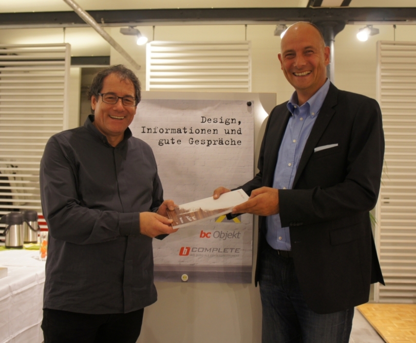 Foto: Dipl.Kfm. Richard Meinberg (rechts), Vertriebsleiter von Office Syncro GmbH, dem Träger von Bcomplete, überreicht Bernd-Christel Hentschker, dem Inhaber von BComplete by bc Objekt e.K. das "Ideenbuch für Einrichter".