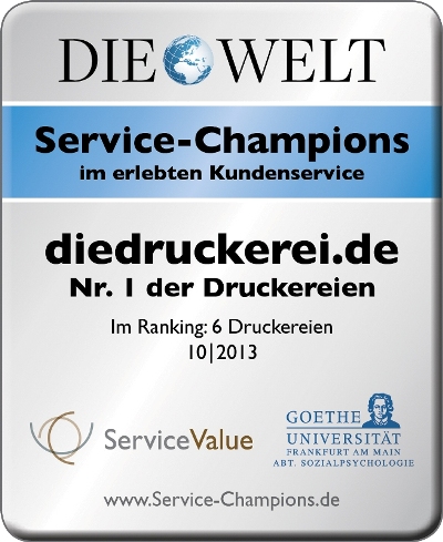 Für die Service-Champions, Deutschlands größtes Service-Ranking, werden jährlich über 1.500 Unternehmen in über 180 Branchen aus Kundensicht bewertet. Die Online-Befragung der ServiceValue GmbH findet in Kooperation mit der Goethe-Universität Frankfurt und der Tageszeitung "Die Welt" statt. "Im Rahmen der Service-Champions werden Marken und Unternehmen jährlich von hunderttausenden Kunden beurteilt. Dieses Jahr hatten wir erstmals auch Druckereien auf dem Prüfstand. In der Branche der Online-Druckereien nimmt diedruckerei.de beim erlebten Kundenservice den Spitzenplatz ein", kommentiert Dr. Claus Dethloff, Geschäftsführer der ServiceValue GmbH, das Ergebnis.