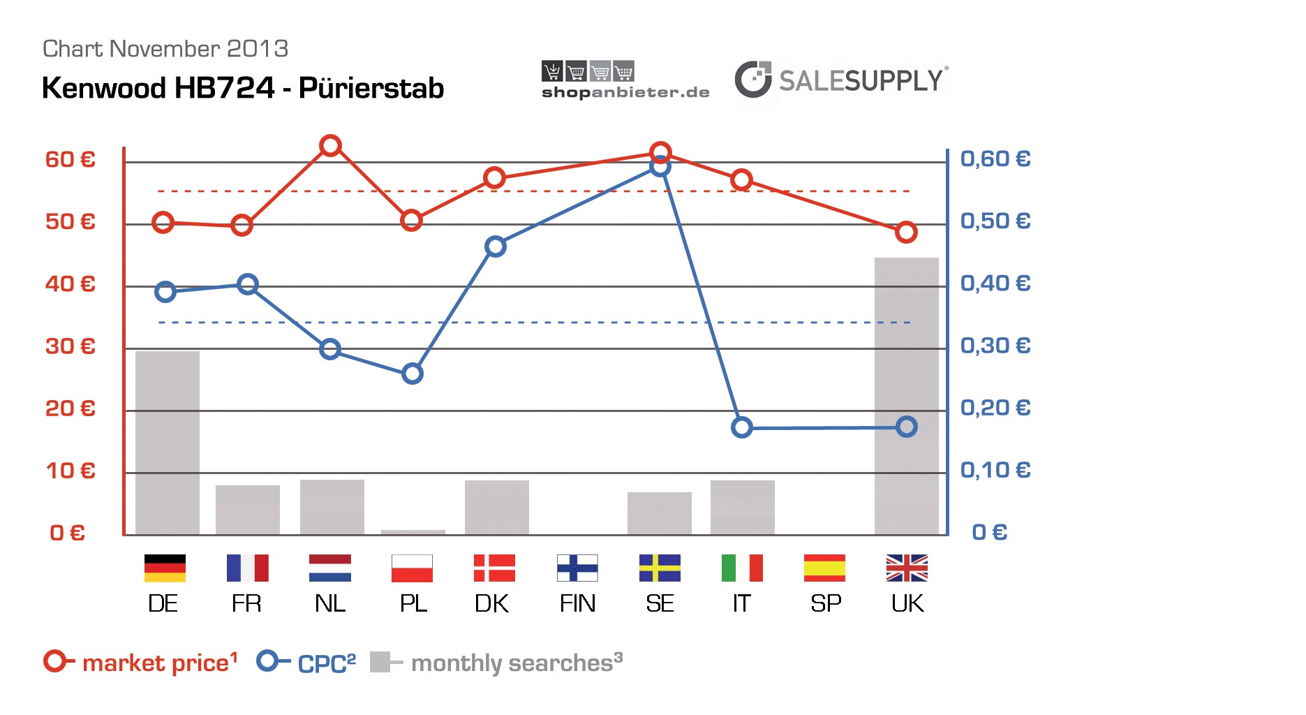 (IINews) - München/Duisburg, 19.11.2013: Initiiert von Salesupply und shopanbieter.de erscheint monatlich der internationale Preisindex. Dieser zeigt bei verschiedenen Produkten regelmäßig deutlich unterschiedliche Marktpotentiale im europäischen E-Commerce auf. Auch im November belegt der aktuelle Marktvergleich teilweise deutlich höhere erzielbare Erlöse. In manchen Fällen können die Unterschiede gravierend sein. In den Niederlanden erzielt bspw. ein Pürierstab der Firma Kenwood, nach Abzug der Marketingkosten, sogar einen um bis zu 45 Prozent höheren Erlös.