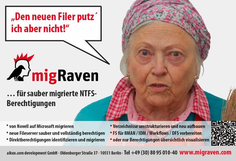 Berlin, den 21. November 2013 - Änderungen in der Fileserver-Struktur und die Anpassungen der NTFS-Berechtigungen sind eine häufig wiederkehrende Tätigkeit in der IT. Es gibt keine wirklich praktikablen Werkzeuge, welche den Administrator wirksam bei dieser Arbeit unterstützen. Das hat oft zur Folge, dass diese ungeliebten, mühseligen Tätigkeiten verschoben werden. Auch IDM-Systeme wie z.B. der MS Forefront Identity Manager, die eine workflowbasierte Berechtigungsvergabe ermöglichen, sind keine richtige Hilfe beim Aufbau der benötigten Verzeichnisbäume und der Vergabe der nötigen Listberechtigungen, ebenso wenig wie Skriptlösungen. Diese Lücke schließt migRaven von aikux.com.