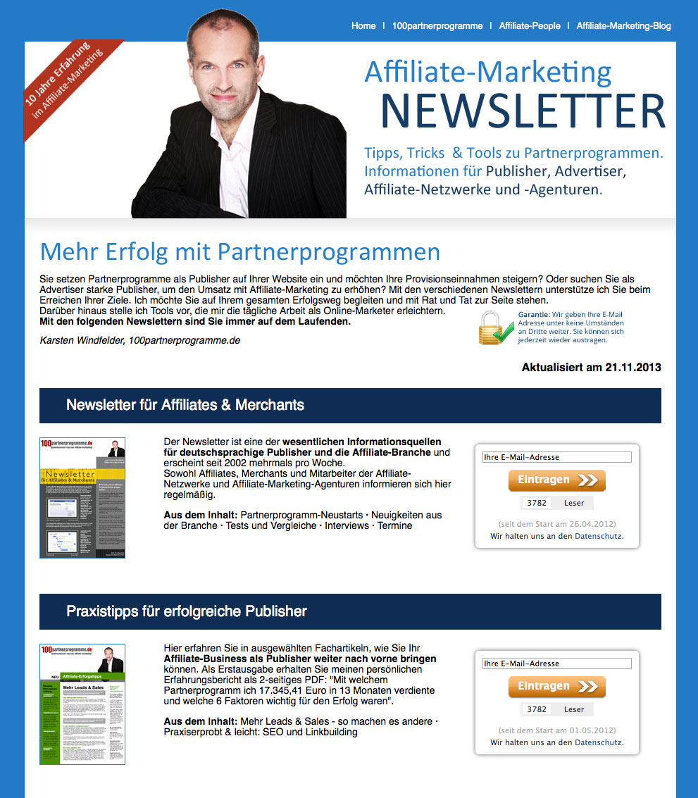 Der Newsletter für Affiliates und Merchants erscheint bereits seit 2002 mehrmals wöchentlich. Ein weiteres Angebot thematisiert ausschließlich Praxistipps für erfolgreiche Publisher. In der Erstausgabe erhält der neue Abonnent einen persönlichen Erfahrungs- und Erfolgsbericht des Verlegers Karsten Windfelder. Im Newsletter „Arbeiten automatisieren, Rankings verbessern, mehr Geld verdienen“ werden jede Woche in Schritt-für-Schritt-Videoanleitungen bewährte Werkzeuge für Affiliates und Online-Marketer vorgestellt. Zur Unterstützung von Einsteigern in der Branche werden eigens eingerichtete Newsletter-Formate für Händler als auch für Webseitenbetreiber angeboten.