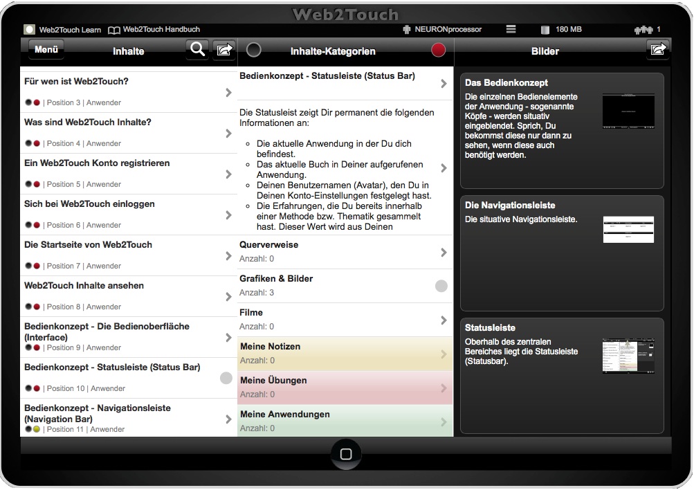 Die Web2Touch Web und iOS App stellt umfangreiche Funktionen zum Lesen oder Erlernen von Inhalten zur Verfügung.