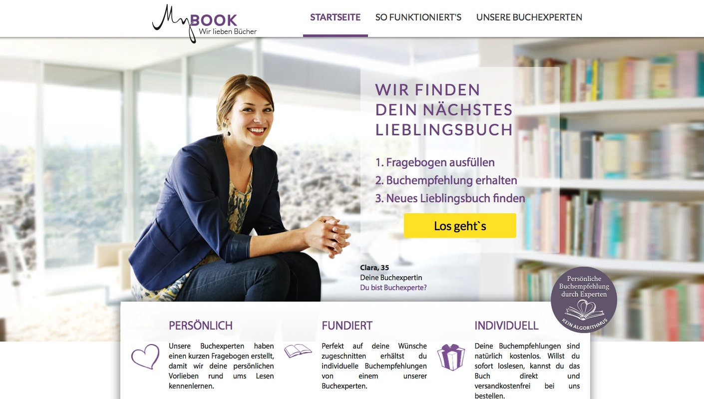 Auf der Webseite mybook.de erhalten Nutzer individuelle Buch-Empfehlungen von echten Experten. Über einen kurzen Fragebogens erkennt das Team aus Buchhändlern und Literaturwissenschaftlern die Persönlichkeit und Interessen des Lesers und gibt im Anschluss aus bisher 4,5 Millionen Buchtiteln drei individuelle Vorschläge. Die Bücher können anschließend direkt integrierten Shop bestellt werden.