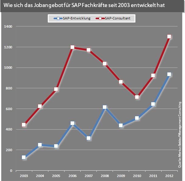 Zur Grafik: "Sappen" lohnt sich: Die Domäne SAP Entwicklung liegt heute beinahe gleichauf mit SAP Consultant. Die Wirtschaftskrise hat die Branche nicht nachhaltig geschädigt: SAP Entwickler/-innen werden vermehrt gesucht. Und auch beim SAP Consultant scheint die Krise überwunden, es werden wieder mehr Jobs als vor der Krise ausgeschrieben. SAP-Spezialist Markus Baldauf über die konjunkturbedingte Entwicklung: "Im Bereich SAP werden auch in Zukunft immer mehr Leute gesucht werden und es wird noch schwieriger für die Unternehmen die besten Leute zu finden. Daher ist die Mitarbeiterbindung auch im Bereich SAP bereits heute das ausschlaggebende Kriterium für die besten SAP Dienstleister bzw. ist hier Headhunting eine ganz wichtige Methode um die besten Mitarbeiter am Jobmarkt zu finden."