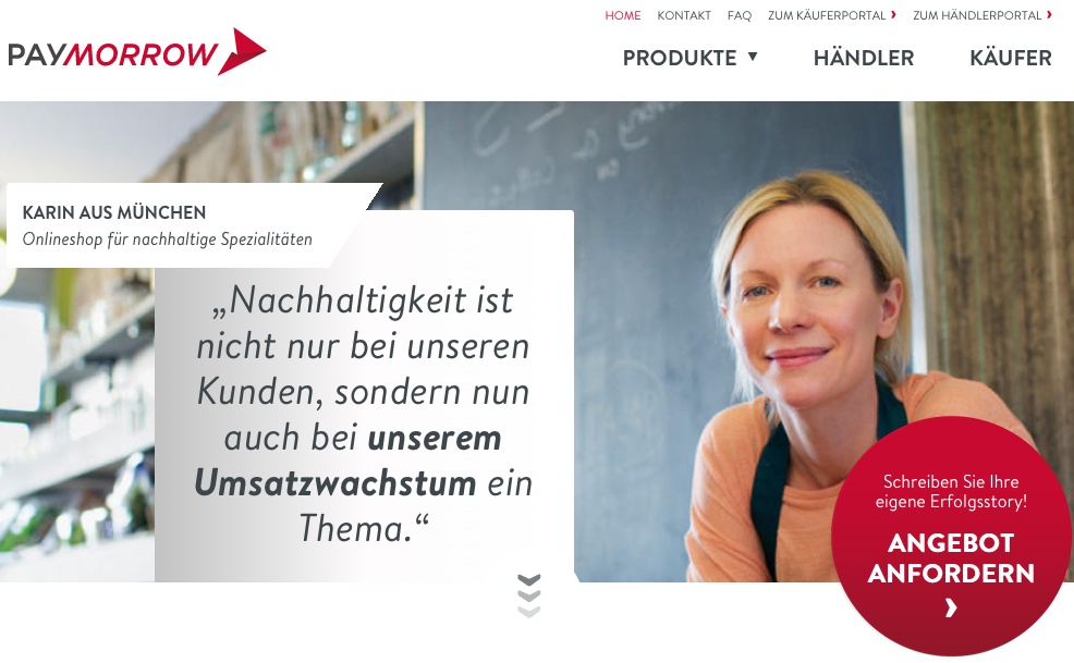 Die Paymorrow GmbH ist Dienstleister für den Rechnungskauf und SEPA-Lastschrift im Internet und garantiert sowohl Händlern als auch Käufern Sicherheit: Dem Händler mit einer 100-Prozent-Zahlungsgarantie und dem Käufer mit der Zahlung oder Abbuchung erst nach Warenerhalt. Der Käufer kann Zahlungsprozesse ohne Registrierung, Weiterleitung oder komplizierte Dateneingabe abwickeln, der Händler erhält neben der Zahlungsgarantie ein serviceorientiertes und individualisiertes Debitorenmanagement mit individuellem Erscheinungsbild.